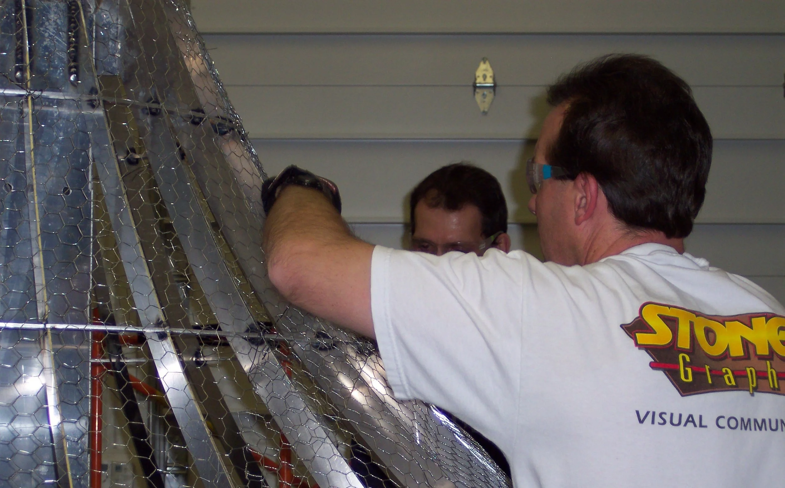 After the Kiss was gelcoated and sanded, it was covered by adhering 500 lineal feet of commercial aluminum foil with an industrial adhesive. Then, the entire Kiss was covered with three coats of polyurethane clear coating for protection and to seal the edges of the foil.